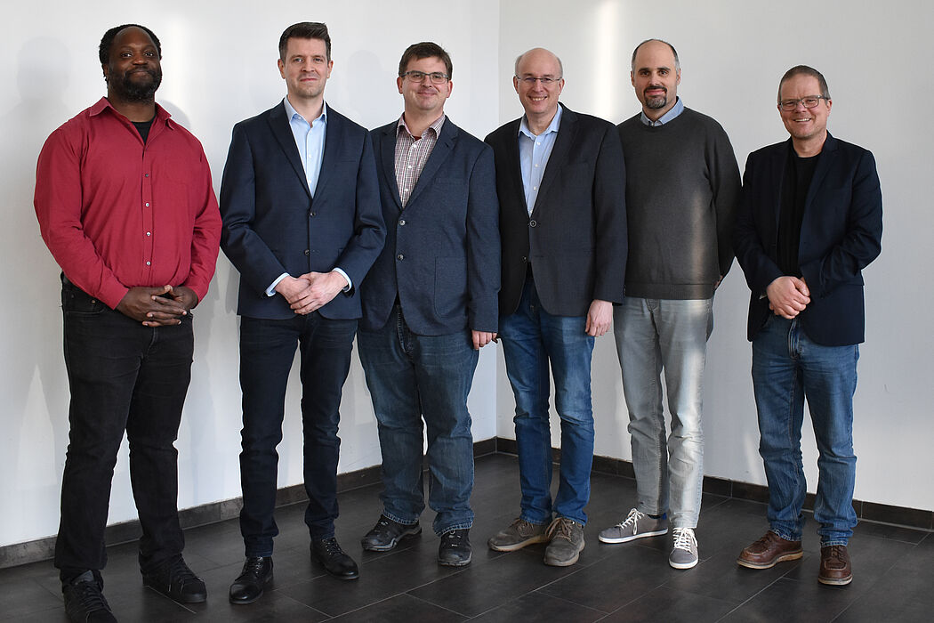 Caption: Head of the Department of Computer Science Prof. Dr Axel Ngonga, Prof. Dr Marcel Campen and Prof. Dr Martin Ulirsch, Dean Prof. Dr Jürgen Klüners, Head of the Department of Mathematics Prof. Dr Balázs Kovacs and Managing Director Dr Markus Holt.